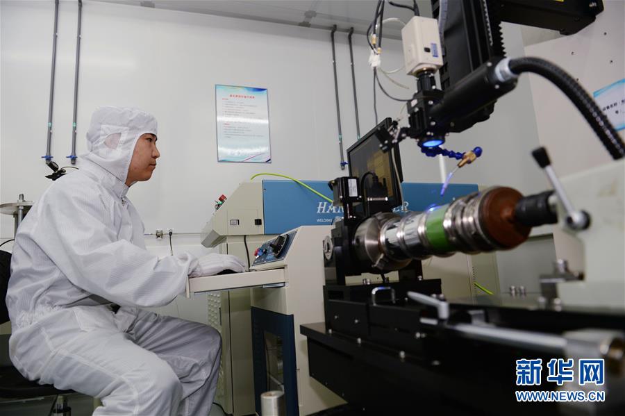 5月22日,中国科学院西安光学与精密机械研究所的科研人员在对真空元器件进行激光焊接。新华社记者 李一博 摄