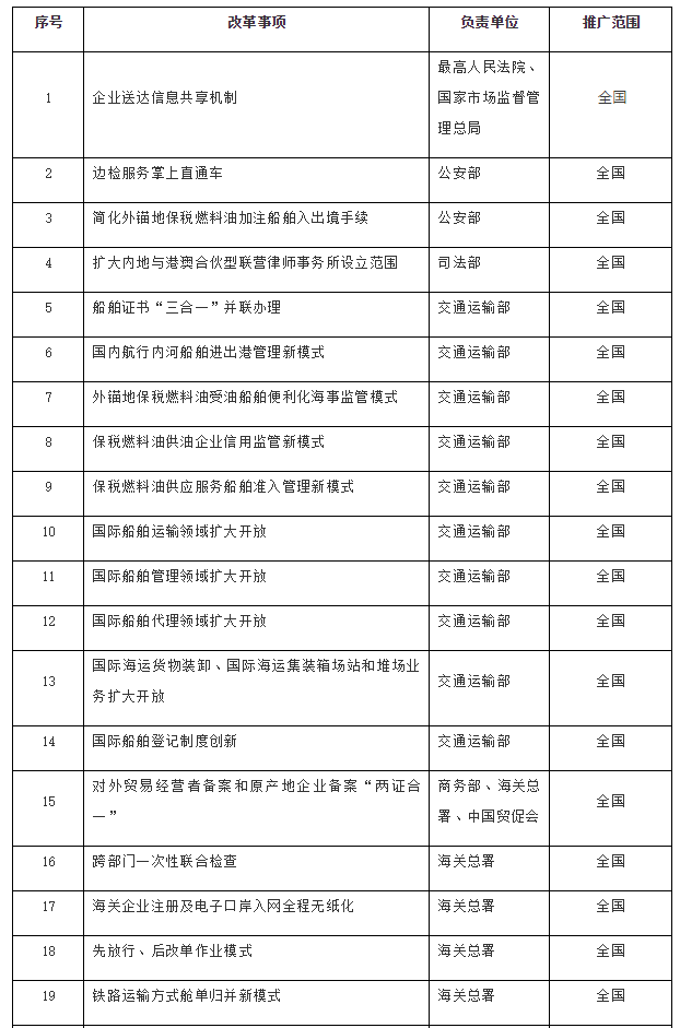 4.事中事后监管措施:“企业送达信息共享机制”、“边检服务掌上直通车”、“简化外锚地保税燃料油加注船舶入出境手续”、“国内航行内河船舶进出港管理新模式”、“外锚地保税燃料油受油船舶便利化海事监管模式”、“保税燃料油供油企业信用监管新模式”、“海关企业注册及电子口岸入网全程无纸化”等7项。