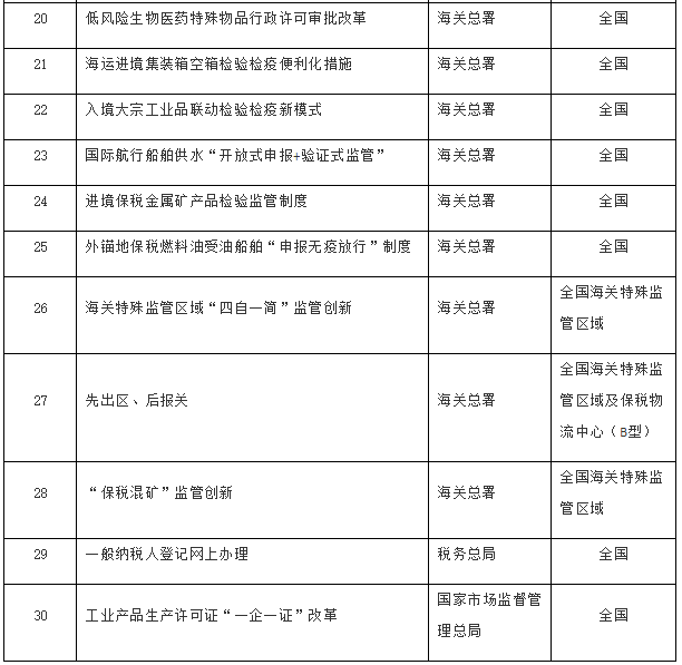 2.投资管理领域:“船舶证书‘三合一’并联办理”、“国际船舶登记制度创新”、“对外贸易经营者备案和原产地企业备案‘两证合一’”、“低风险生物医药特殊物品行政许可审批改革”、“一般纳税人登记网上办理”、“工业产品生产许可证‘一企一证’改革”等6项。
