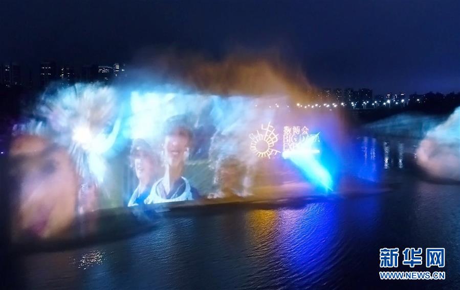市民在贵阳市观山湖公园内体验数谷之夜活动中的水幕电影(5月22日摄)。新华社记者刘续 摄