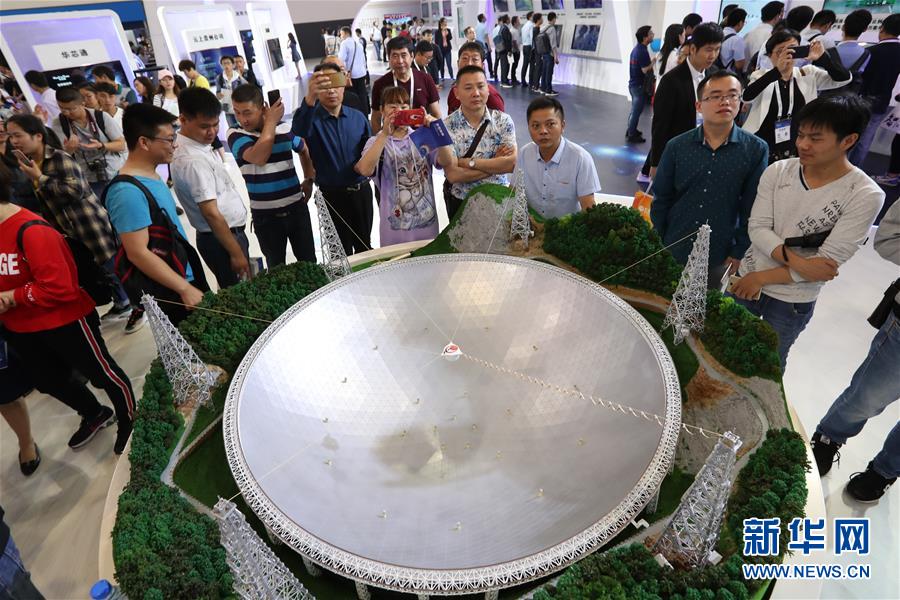 5月26日,市民在博览会现场参观FAST射电望远镜模型。当日,2018中国国际大数据产业博览会在贵州省贵阳市开幕。 新华社记者 刘续 摄