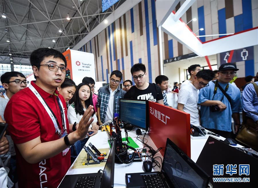 5月26日,工程师(前左)在数博会上向参观者介绍无人智慧工厂。当日,2018中国国际大数据产业博览会在贵州省贵阳市开幕。本次数博会上,无人驾驶、虚拟试衣镜等“黑科技”引人关注。 新华社记者 陶亮摄