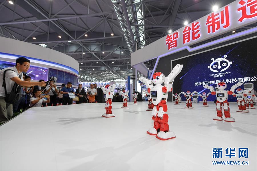 智能机器人在2018世界制造业大会上为观众表演舞蹈(5月25日摄)。无需土壤,几台水箱和一瓶营养液即可打造“家庭农场”;手掌大小的机器人也有“洪荒之力”,智能搬运“庞然大物”;与30多种语言实时互译,人工智能让你轻松追逐“诗和远方”……于安徽合肥举行的2018世界制造业大会上,一批前沿技术和创新成果集中亮相。在创新引领下,中国制造正逐步显现新的发展图景。这一点,从世界制造业大会上就能明显感知。 新华社记者 张端 摄