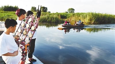 夕阳下,安新县圈头村的乐手乘船在淀上练习古曲,悠扬的乐声在芦苇荡间久久回荡,吸引了众多游客的目光。圈头村音乐会作为国家级非遗项目,在白洋淀远近闻名。