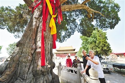 容城县晾马台村的老人讲述晾马台遗址中千年古柏的历史。