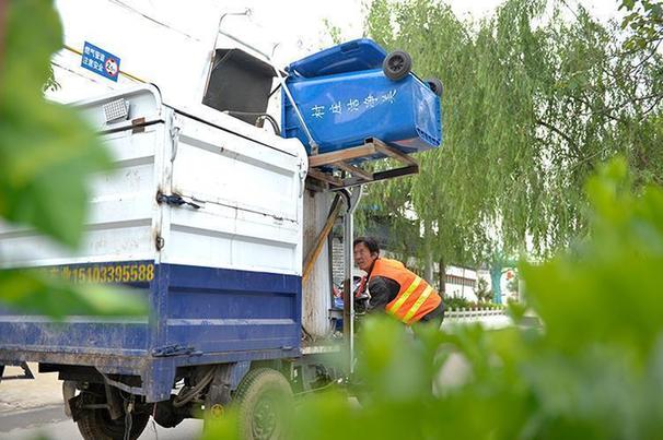 5月15日,在邢台县羊范镇祁村,环卫工人在用垃圾收集车收集垃圾。 新华社记者牟宇摄