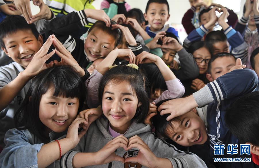 四川省青川县马鹿小学四年级一班的学生用感恩的手势,感谢全国人民的关爱(4月25日摄)。2008年5月16日,青川县马鹿小学学生徐广和他的100多名伙伴,自发在本村公路旁设立3个活动点,向来自全国各地的援助人员打出感恩的标牌。新华社记者 陶明 摄
