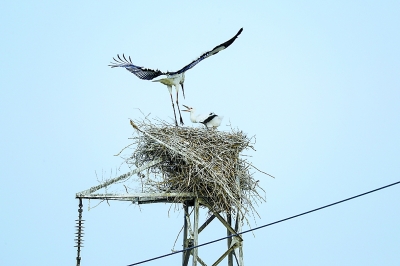 唐山丰南区沿海的高压电线杆上,一只东方白鹳成鸟展翅为幼鸟遮阳。