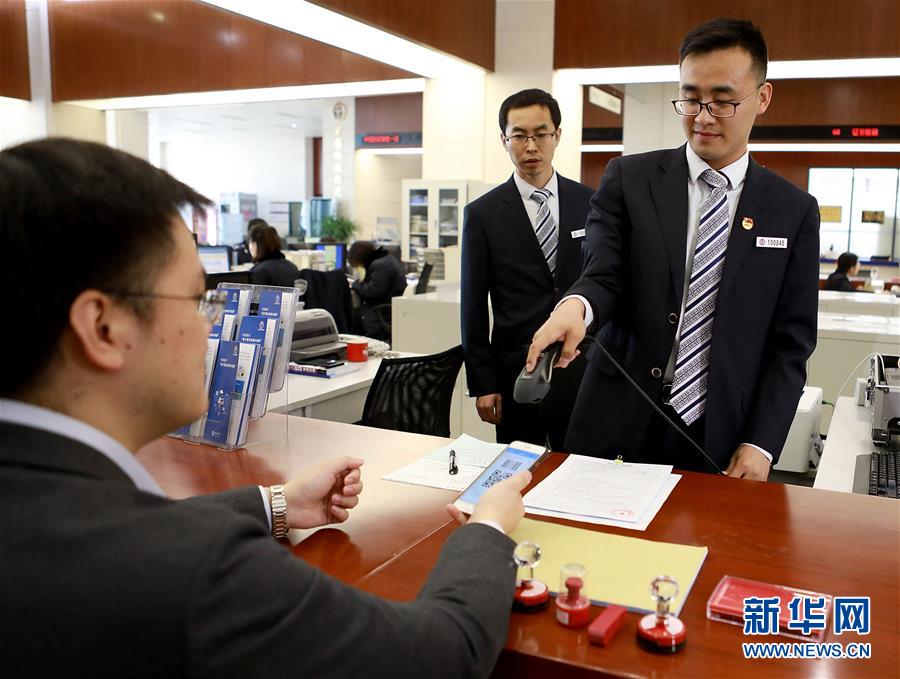 4月9日,中国国家市场监督管理总局推出的手机版电子营业执照在天津自贸试验区东疆片区首批发放。这是工作人员为天津花生好车汽贸有限公司董事长陈鹏云(左一)扫码登记。新华社发