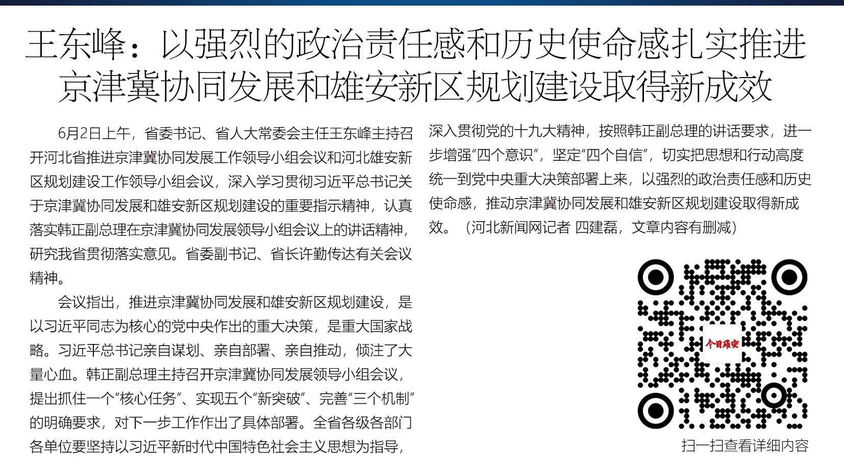 【雄安之声】王东峰:以强烈的政治责任感和历史使命感扎实推进京津冀协同发展和雄安新区规划建设取得新成效
