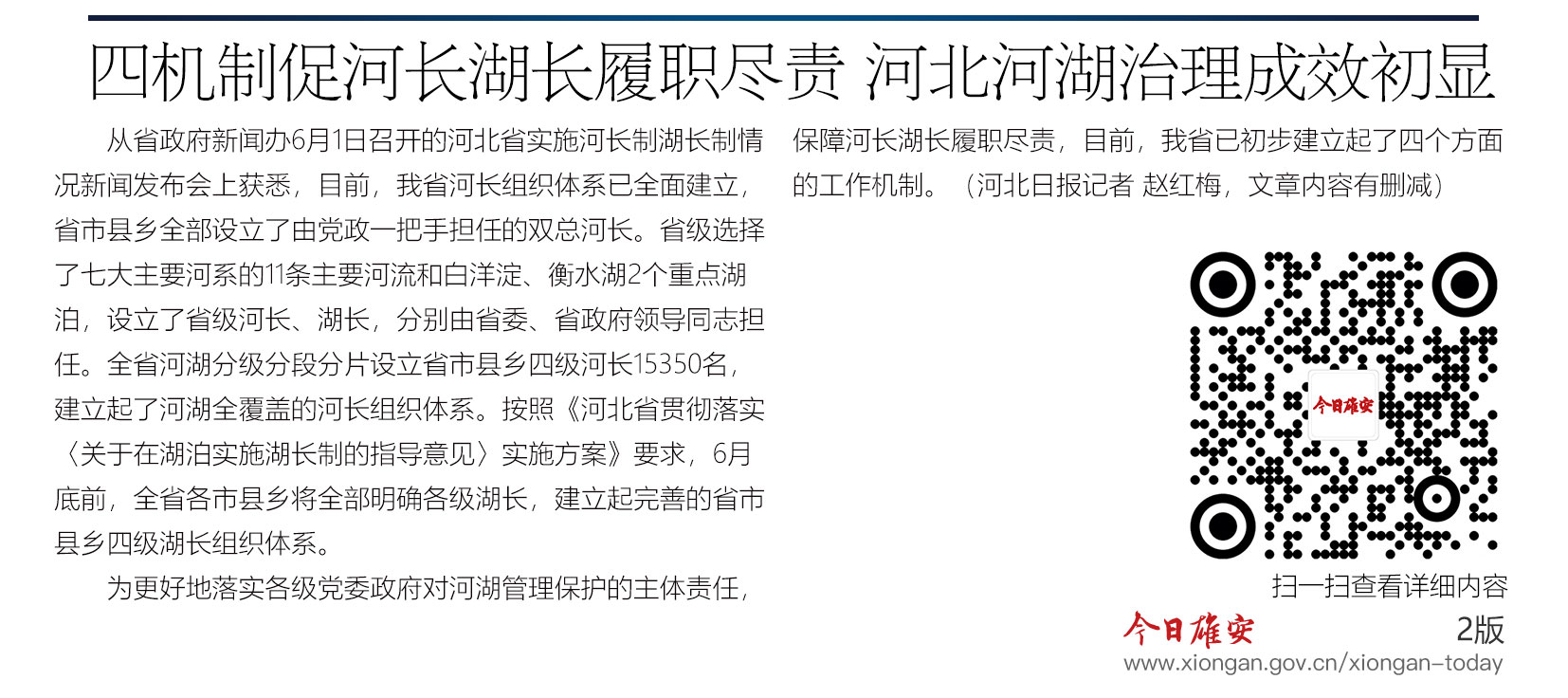 近日,河北省委办公厅、省政府办公厅联合印发《河北省贯彻落实〈关于在湖泊实施湖长制的指导意见〉实施方案》。