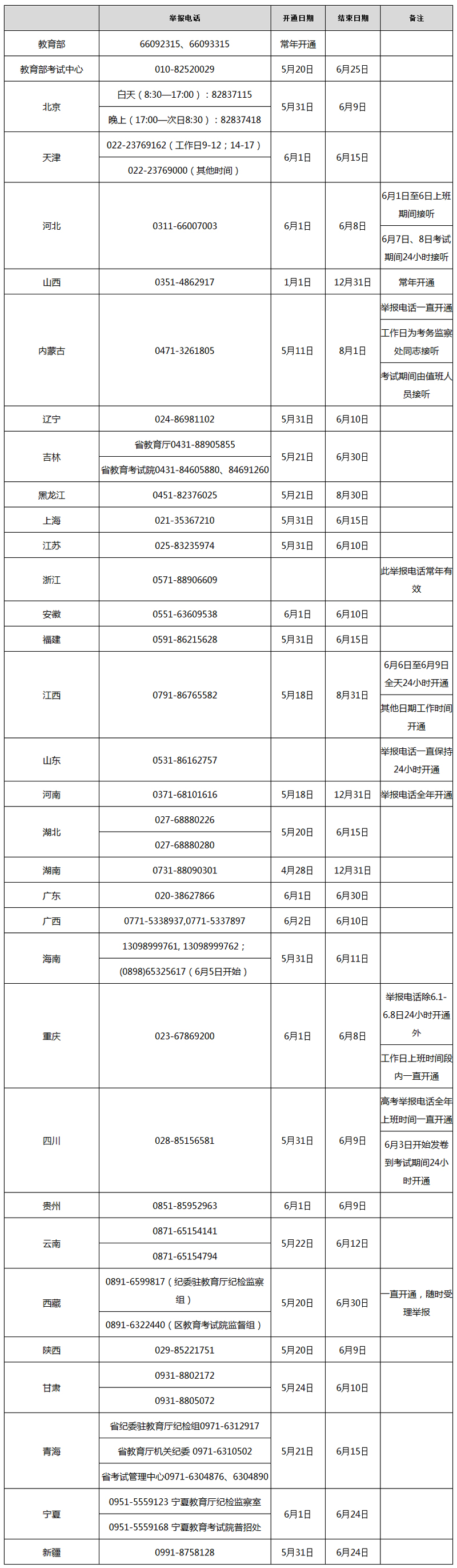 近日,教育部统一公布了教育部以及全国31个省(区、市)教育行政部门和招生考试机构2018年的高考举报电话,欢迎广大考生、家长及社会各界人士及时举报反映涉及2018年高考安全的线索。教育部及各省(区、市)将会同有关部门根据举报线索第一时间核查处理,坚决维护高考公平公正。