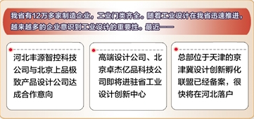 此外,总部位于天津的京津冀设计创新孵化联盟已经备案,很快将在河北落户。该联盟秘书长王朋表示,河北拥有良好的制造业基础,联盟拥有设计、手板、模具加工、投融资、跨境电商等67家上下游企业、3个国家级设计中心,落地河北后,既能通过工业设计资源助力河北制造业转型升级,又能以产品为核心,整合优势资源,孵化更多的河北双创企业。