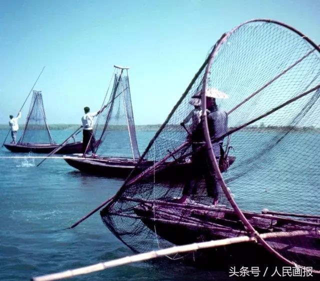 图片为新中国成立之初,这里的渔农生产合作社的社员们在用大罩捕鱼。(1953年)摄影 宋学广