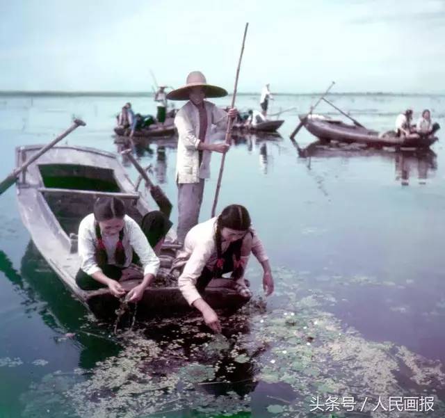 白洋淀盛产菱角,这是当年采菱人在慢行的木船上,快速地手捞菱角。(1953年)摄影 宋学广
