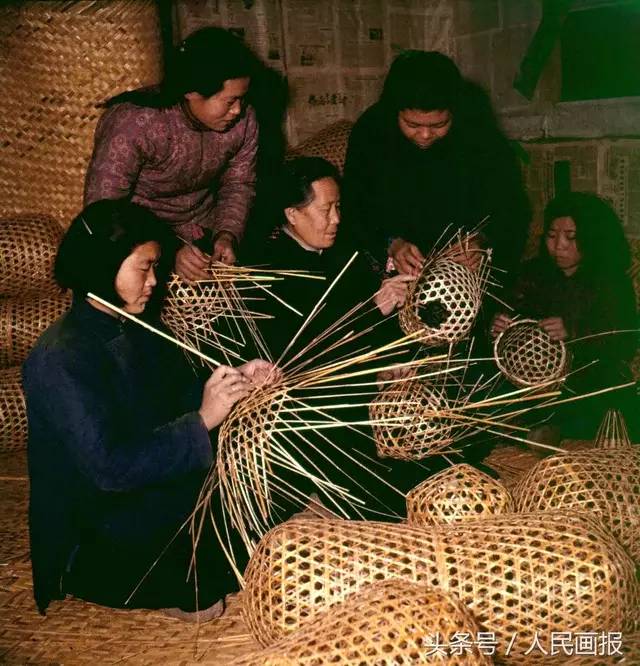 白洋淀杨庄子生产队的妇女们利用晚间编织捕鱼需要用的鱼篓。(1959年)摄影 李曙