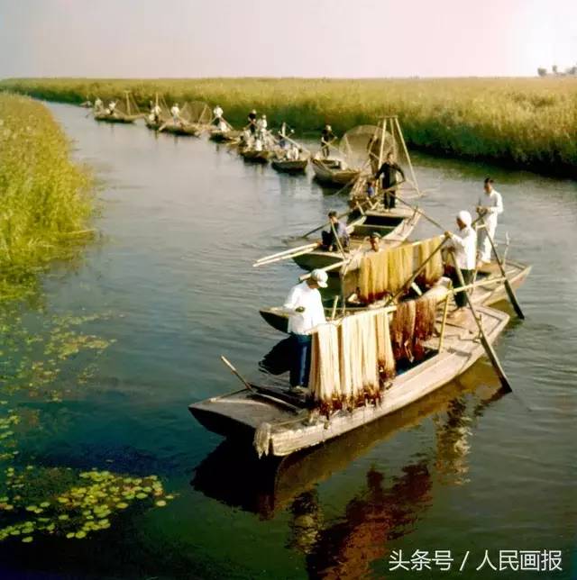 作为华北平原上最大的淡水湖泊,白洋淀物产丰富,盛产大米、鱼虾、菱藕和安州苇席。人民公社成立后,新安人民公社组建了捕鱼专业队。(1960年)摄影张修身、王德