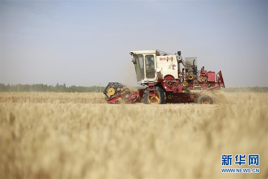 6月10日,联合收割机在河北省阜城县蒋坊乡王吕村麦田收割小麦。 “三夏”时节,河北省小麦由南至北进入大面积收获期。河北省预计共投入110多万台(套)农机具开展夏收夏种,其中小麦联合收割机10万台,小麦机收率达99%。新华社记者朱旭东摄