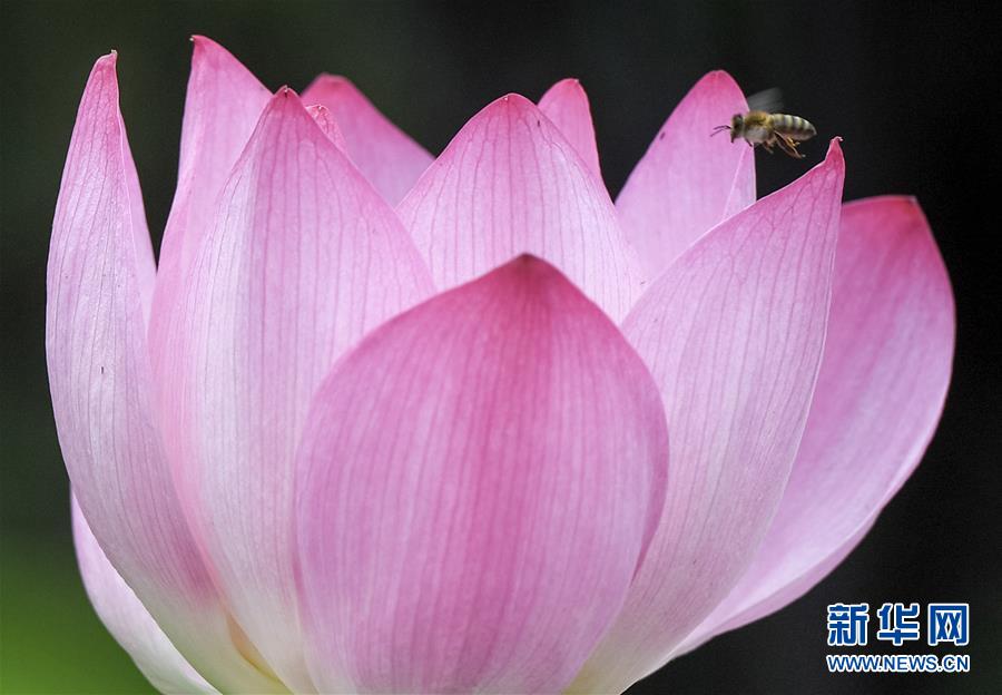 6月10日,在安徽省合肥市包河公园,一只蜜蜂飞向盛开的荷花。随着气温升高,安徽省合肥市包河公园内荷花次第绽放。 新华社记者 张端 摄