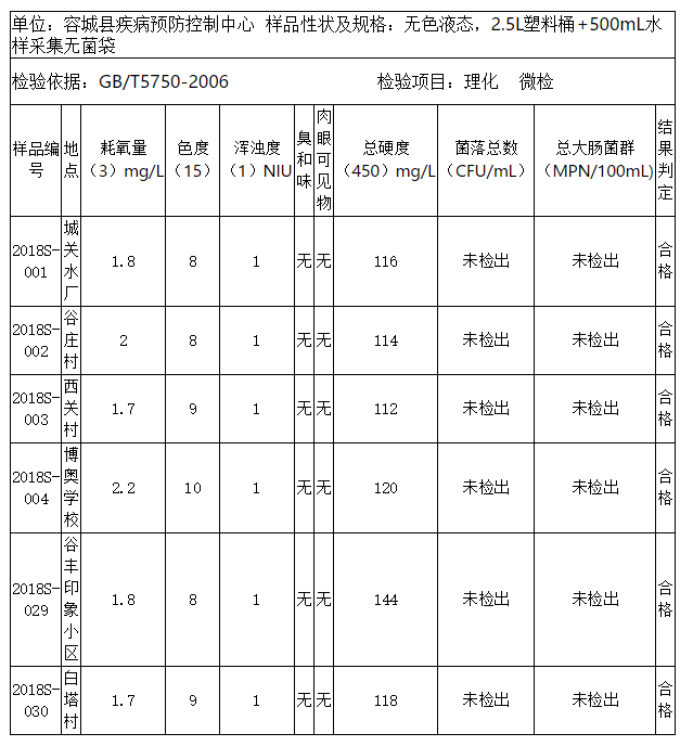 容城县2018年第二季度生活饮用水水质检测结果公示