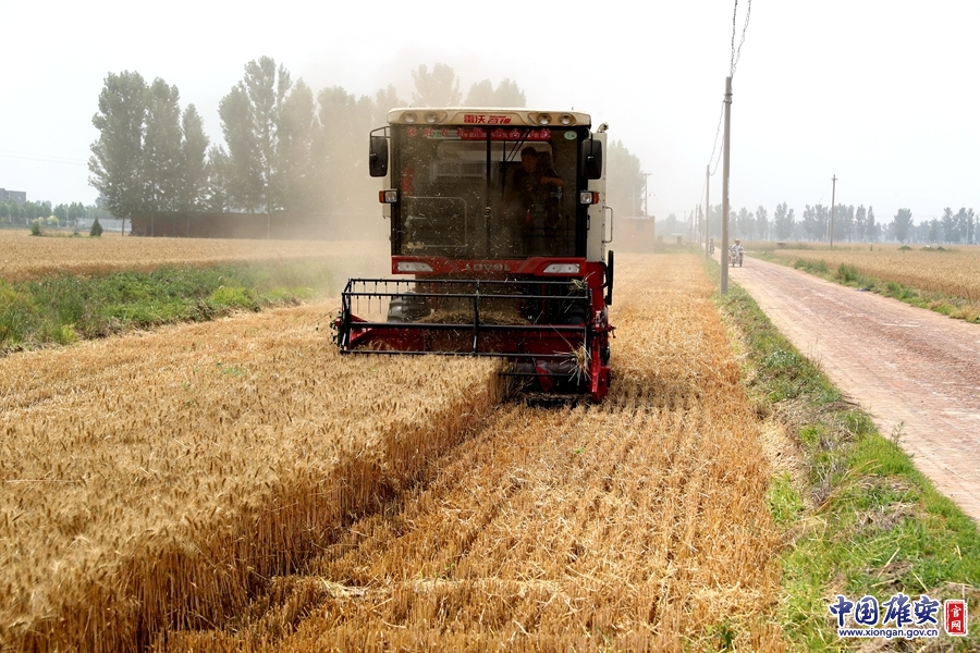 一块不规整的麦田,被收割机画出一道道平仄的韵脚。图为收割机正在安新县大王镇小王村收割小麦。记者崔利杰摄