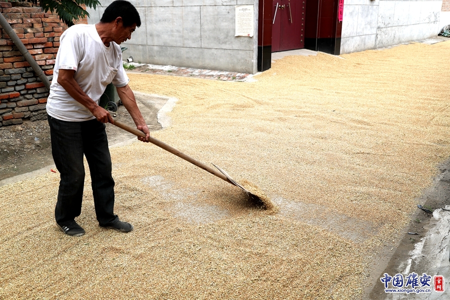 麦收时节,村民忙碌着装粮运粮,家家户户喜洋洋。图为安新县大王镇于庄村村民正在家门口晾晒刚收获的小麦。记者崔利杰摄