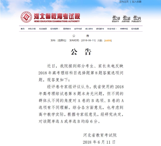经评卷专家组评议认为,河北省使用的2018年高考理综试卷第8题本身无问题,但不同的群体从不同的角度对A卷的B选项、B卷的A选项有不同的理解。综合各方面意见,也考虑到高中数学实际,根据专家组意见,经研究决定,对该题单选A或单选B均给6分。