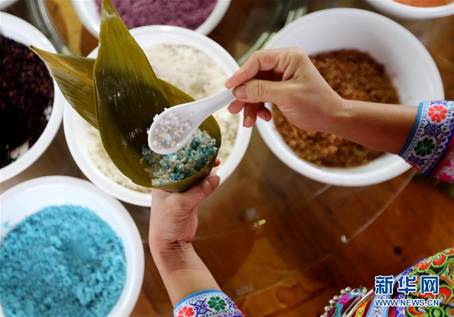 6月12日,在广西柳州市融安县雅瑶乡,居民在包彩色粽子。端午节将至,融安县雅瑶乡居民用花草汁液把糯米染成彩色,制成独具特色的彩色粽子,煮熟的粽子香糯可口,色彩艳丽。 新华社发(覃庆和 摄)