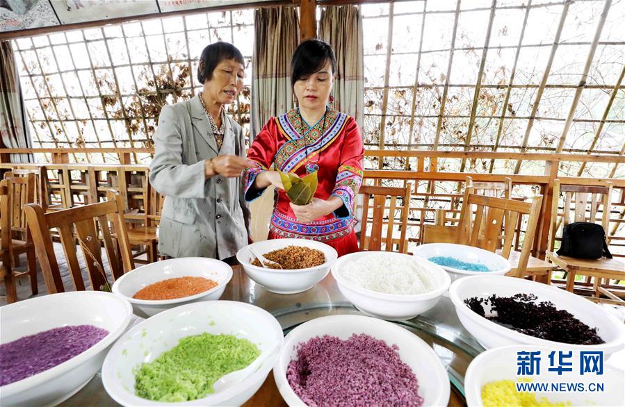 6月12日,在广西柳州市融安县雅瑶乡,居民在包彩色粽子。端午节将至,融安县雅瑶乡居民用花草汁液把糯米染成彩色,制成独具特色的彩色粽子,煮熟的粽子香糯可口,色彩艳丽。