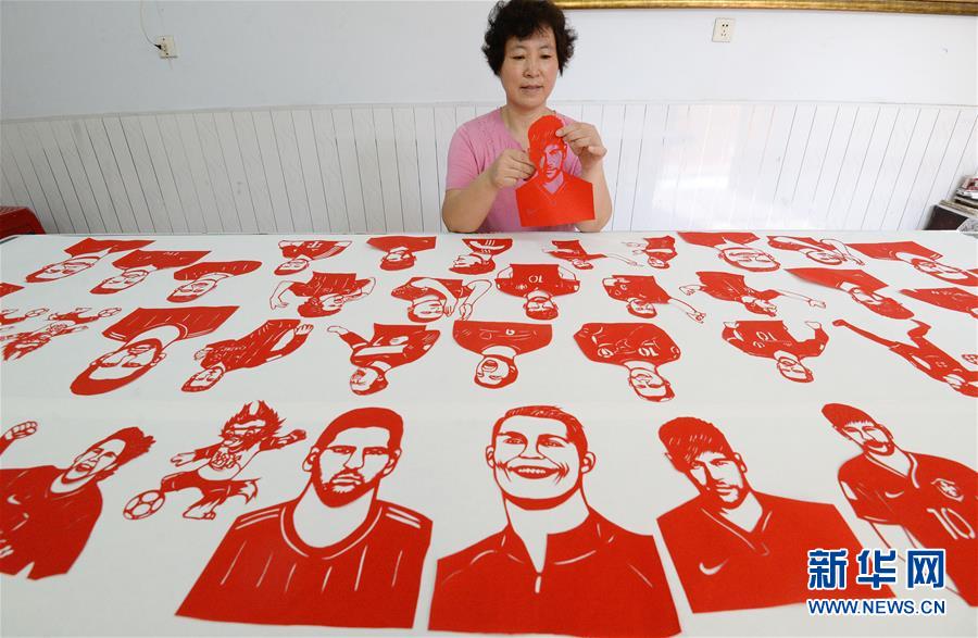 6月12日,河北省邯郸市民间剪纸艺人冯石萍在创作世界杯主题剪纸作品。日前,河北省邯郸市民间剪纸艺人冯石萍利用两周时间,创作出以梅西、C罗、内马尔等球星为原型的剪纸作品,迎接世界杯的到来。新华社发(郝群英 摄)