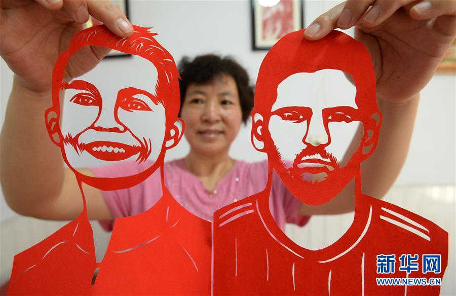 6月12日,河北省邯郸市民间剪纸艺人冯石萍展示她创作的球星剪纸作品。日前,河北省邯郸市民间剪纸艺人冯石萍利用两周时间,创作出以梅西、C罗、内马尔等球星为原型的剪纸作品,迎接世界杯的到来。新华社发(郝群英 摄)