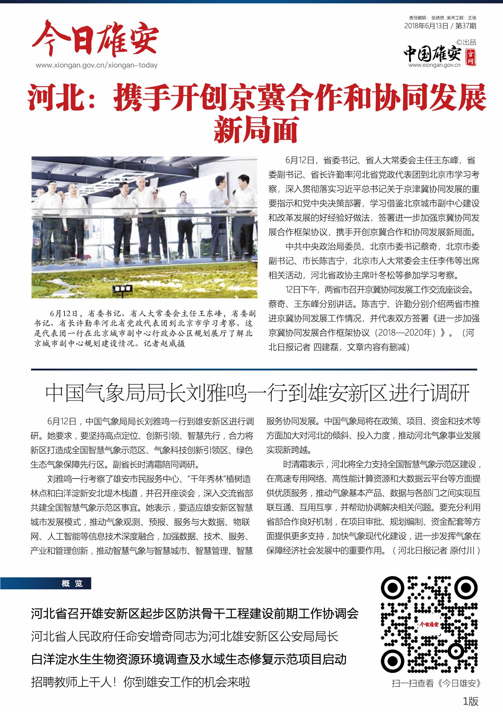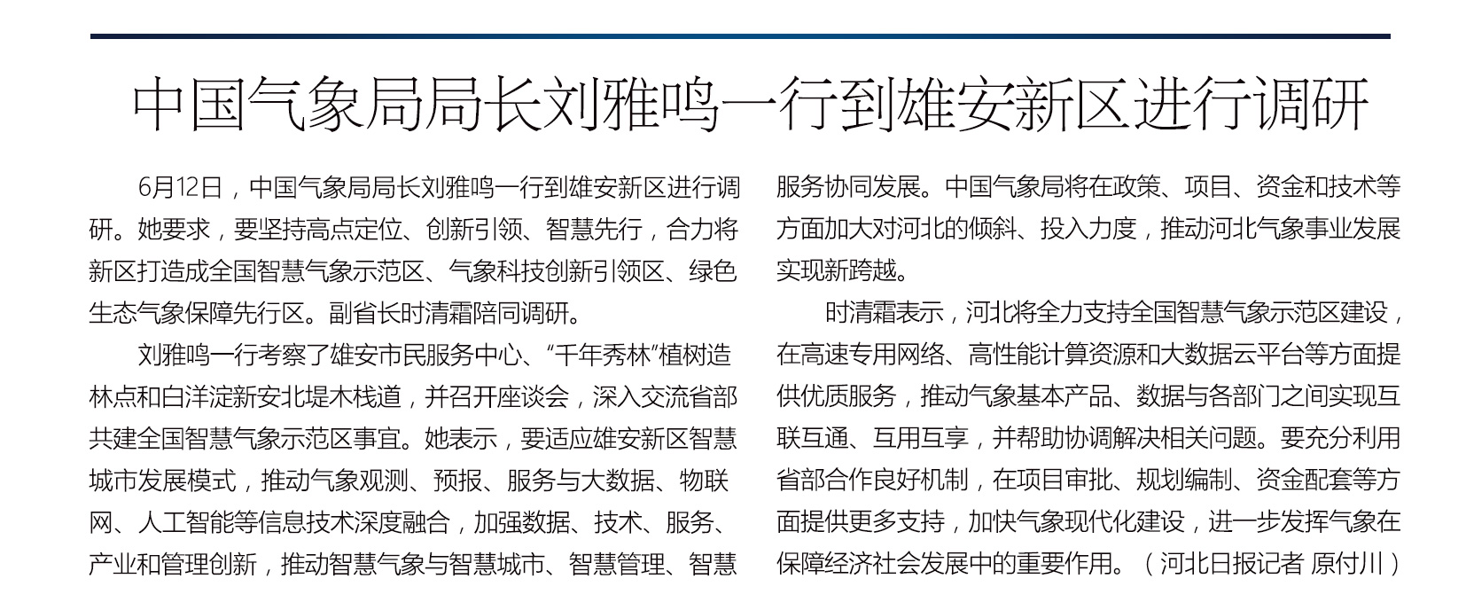 6月12日,中国气象局局长刘雅鸣一行到雄安新区进行调研。