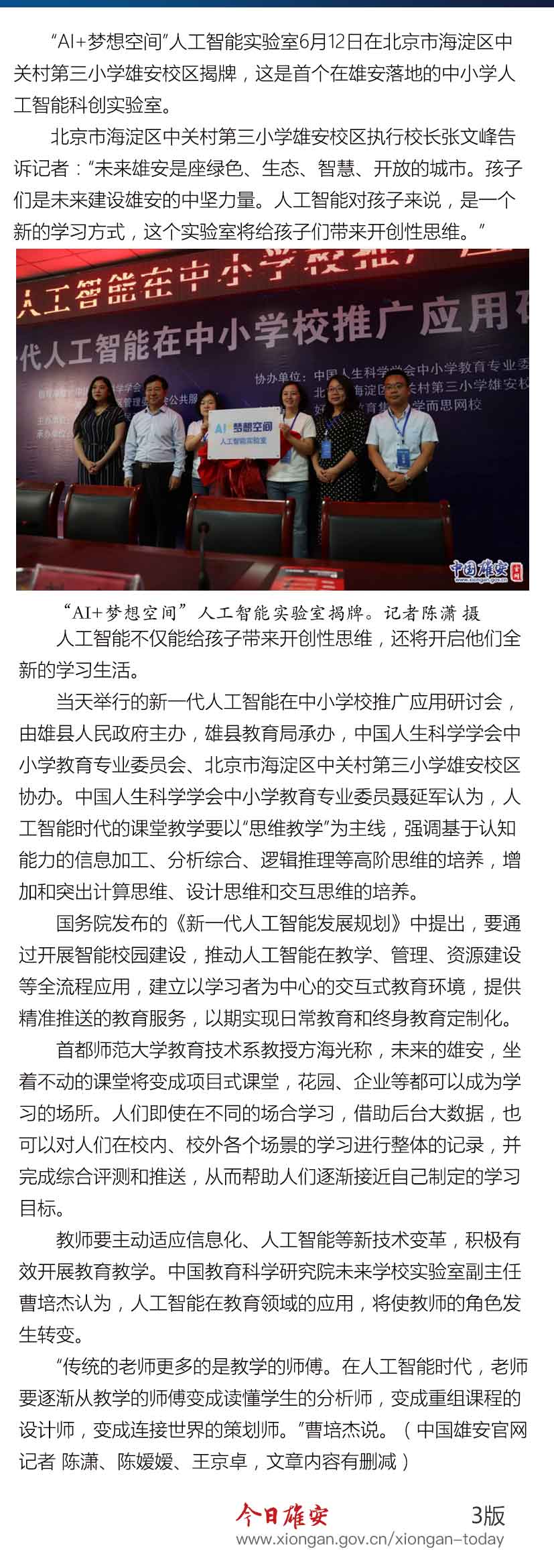 “AI+梦想空间”人工智能实验室6月12日在北京市海淀区中关村第三小学雄安校区揭牌,这是首个在雄安落地的中小学人工智能科创实验室。