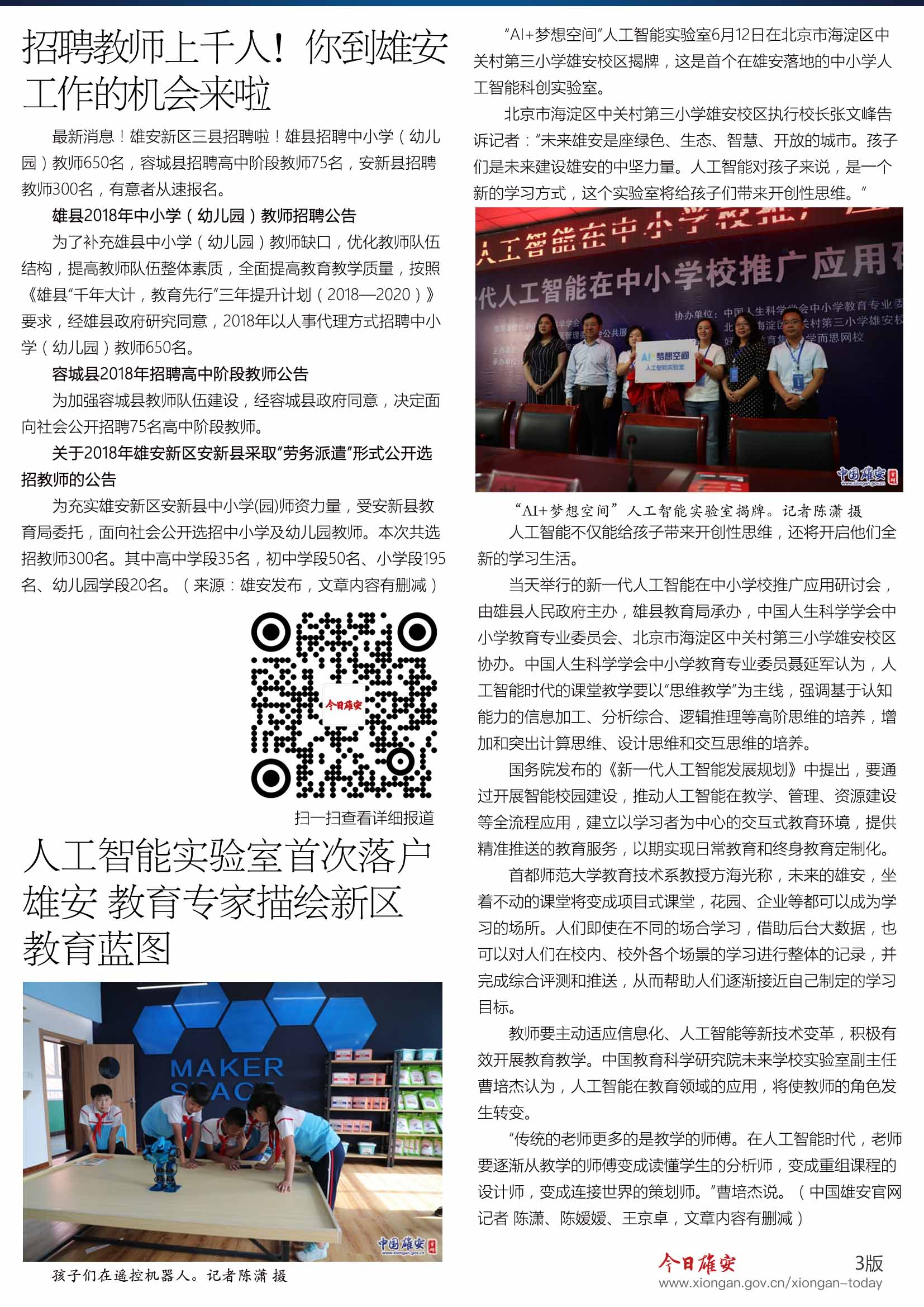 人工智能实验室首次落户雄安 教育专家描绘新区教育蓝图