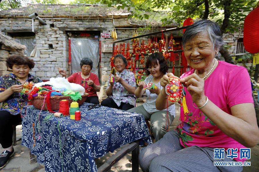 6月13日,山东省临沂市沂南县铜井镇竹泉村村民在缝制香囊。端午节将至,人们开始包粽子、缝香囊,体验民俗活动,品味传统文化。新华社发(王彦冰 摄)