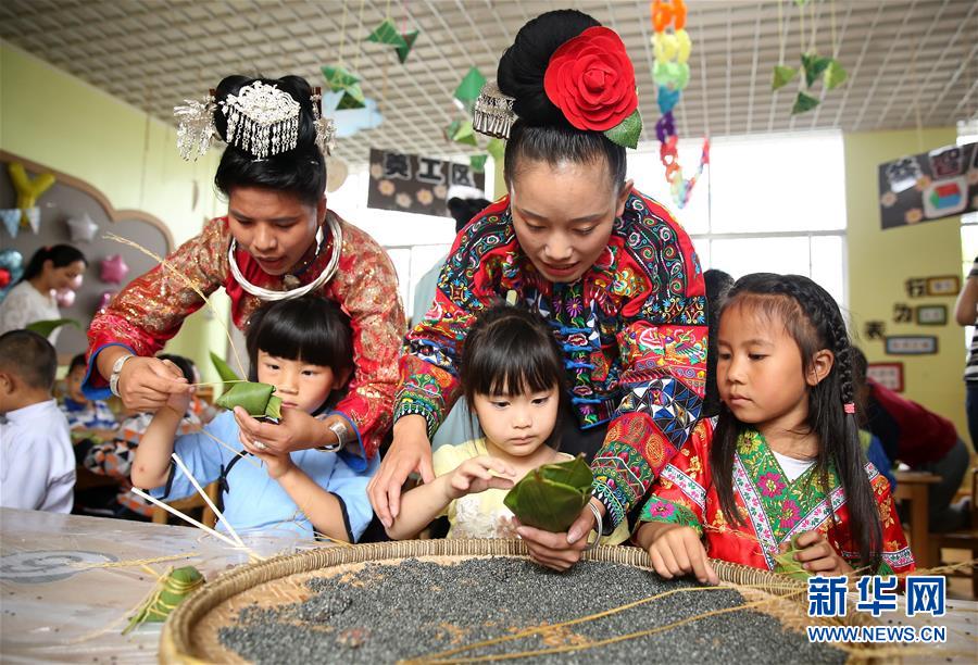 6月13日,在贵州省黔东南苗族侗族自治州丹寨县示范幼儿园,小朋友们在家长的指导下体验包粽子。端午节将至,人们开始包粽子、缝香囊,体验民俗活动,品味传统文化。新华社发(黄晓海 摄)