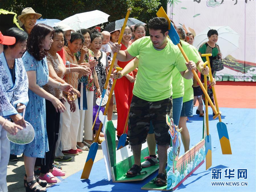 6月13日,在安徽省合肥市包河区丝绸新村广场,社区居民与外国青年一起参加“旱地龙舟赛”趣味活动。端午节将至,人们开始包粽子、缝香囊,体验民俗活动,品味传统文化。新华社发(张洪金 摄)