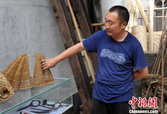 杨福春展示捕鱼工具“密封”,在抓鱼的地方用芦苇围起来,出口处摆上这个“密封”,鱼就会钻到“密封”里。 韩冰 摄