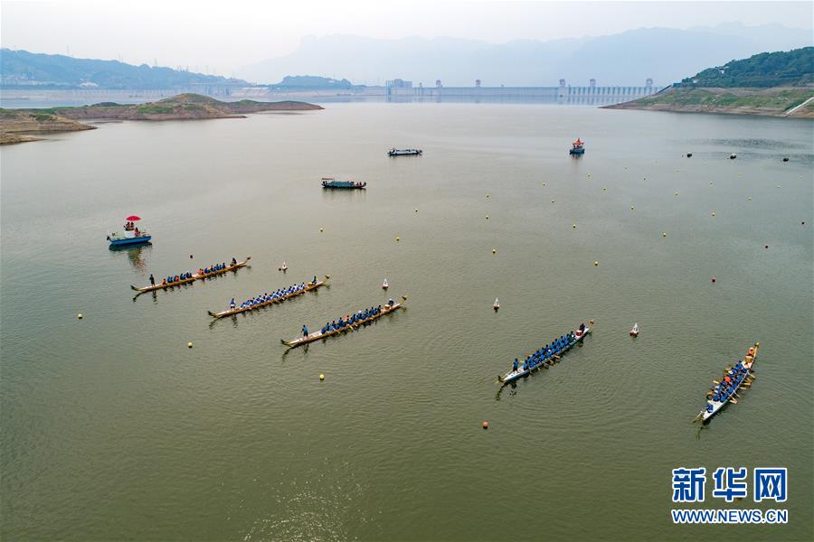 6月14日,参赛龙舟队伍在比赛中奋力争先。当日,屈原故里湖北省秭归县举行龙舟赛,迎接端午节的到来。