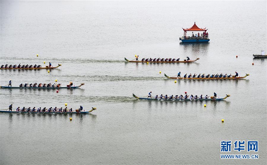 6月14日,参赛龙舟队伍在比赛中奋力争先。 新华社发(王爱平 摄)