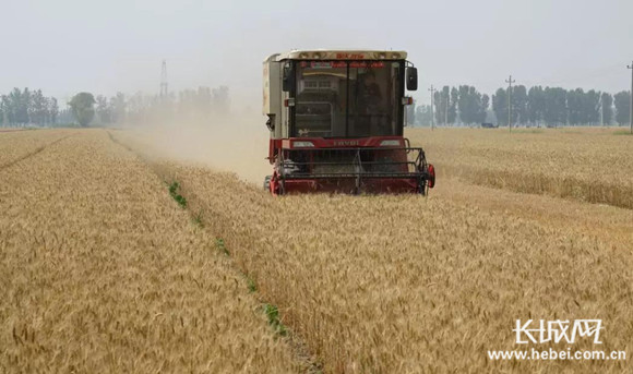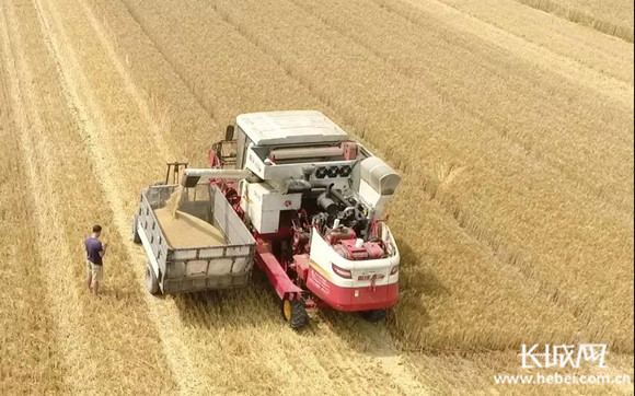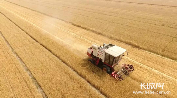 安新县大王镇的麦田里联合收割机正在紧张作业。苏丹丹摄