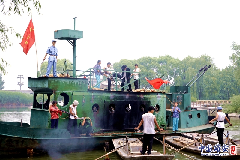 6月16日,白洋淀景区内上演的红色情景剧《痛打鬼子包运船》中,雁翎队占领了日本侵略者的包运船。记者张仕林 摄