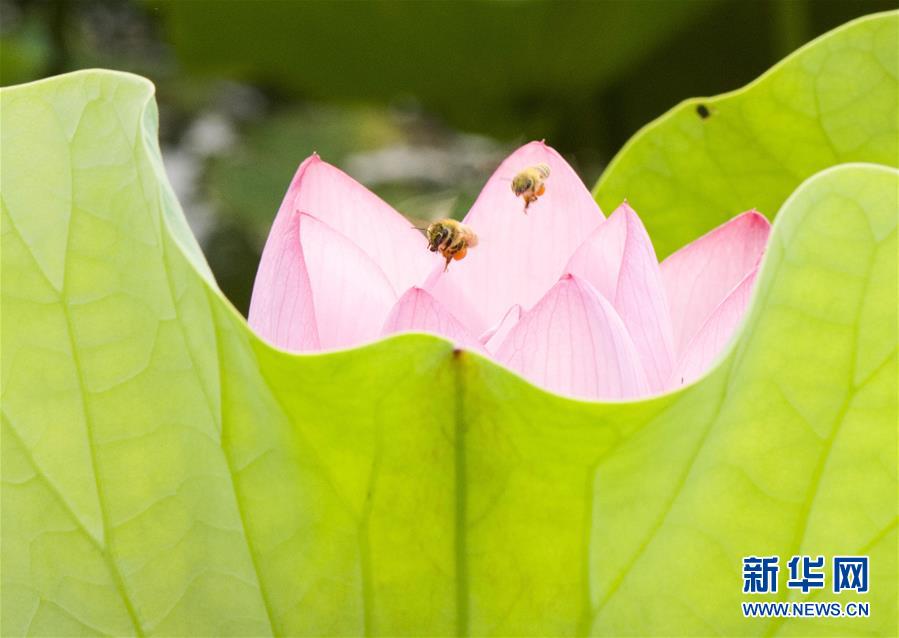 6月17日,在江苏省无锡市管社山庄,两只蜜蜂飞向盛开的荷花。