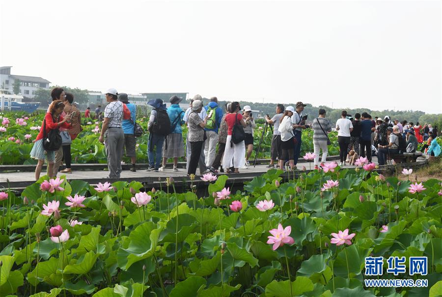 6月17日,游人在江苏省无锡市管社山庄赏荷。 新华社发(潘正光 摄)