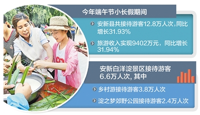 记者6月18日从安新县旅游发展局获悉,端午节小长假期间安新县共接待游客12.8万人次,同比增长31.93%;旅游收入实现9402万元,同比增长31.94%。其中,安新白洋淀景区接待游客6.6万人次,乡村游接待游客3.8万人次,淀之梦郊野公园接待游客2.4万人次。