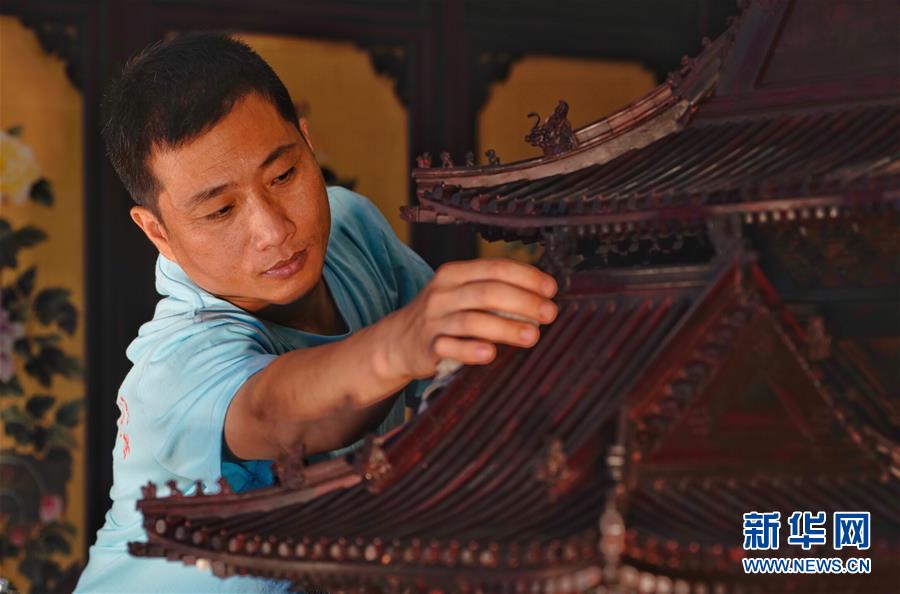 6月18日,李长久在位于河北省大城县的京华木作红木家具厂保养故宫角楼模型。河北省大城县京华木作工艺团队的李长久带领同事,以檀香紫檀为原料,建成了1:16故宫角楼模型。李长久和同事们耗时一年多,打磨数万个零件,榫卯结构连接,用匠心传承中华传统文化。新华社记者 邢广利摄