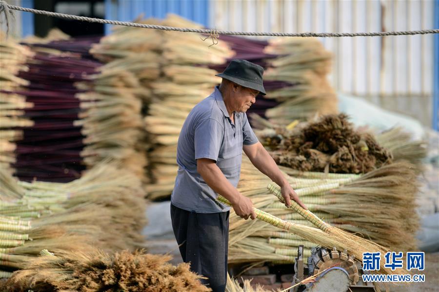 6月19日,乐亭县毛庄镇大荣笤帚专业合作社员工在加工笤帚。新华社记者 牟宇 摄