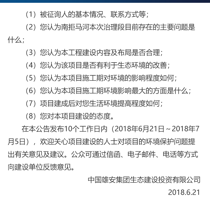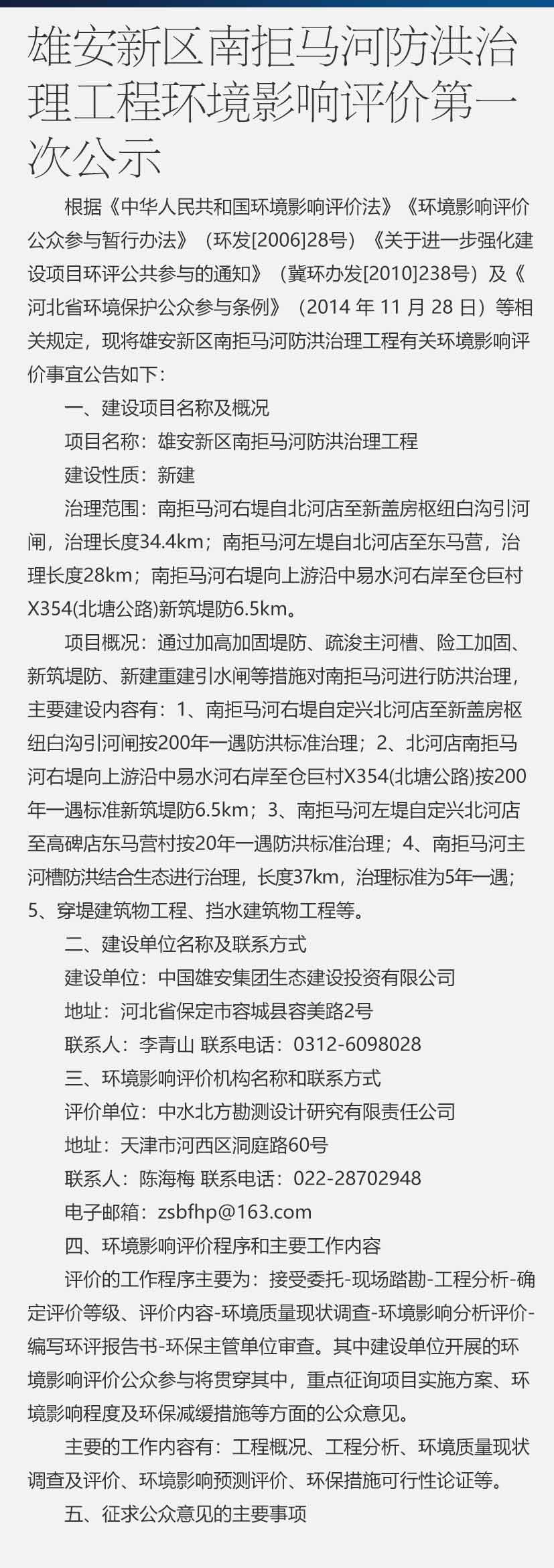 根据相关规定,现将雄安新区南拒马河防洪治理工程有关环境影响评价事宜公示。
