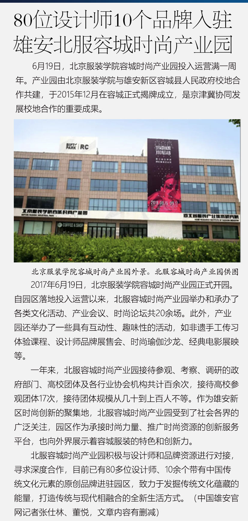 6月19日,北京服装学院容城时尚产业园投入运营满一周年。产业园由北京服装学院与雄安新区容城县人民政府校地合作共建,于2015年12月在容城正式揭牌成立。