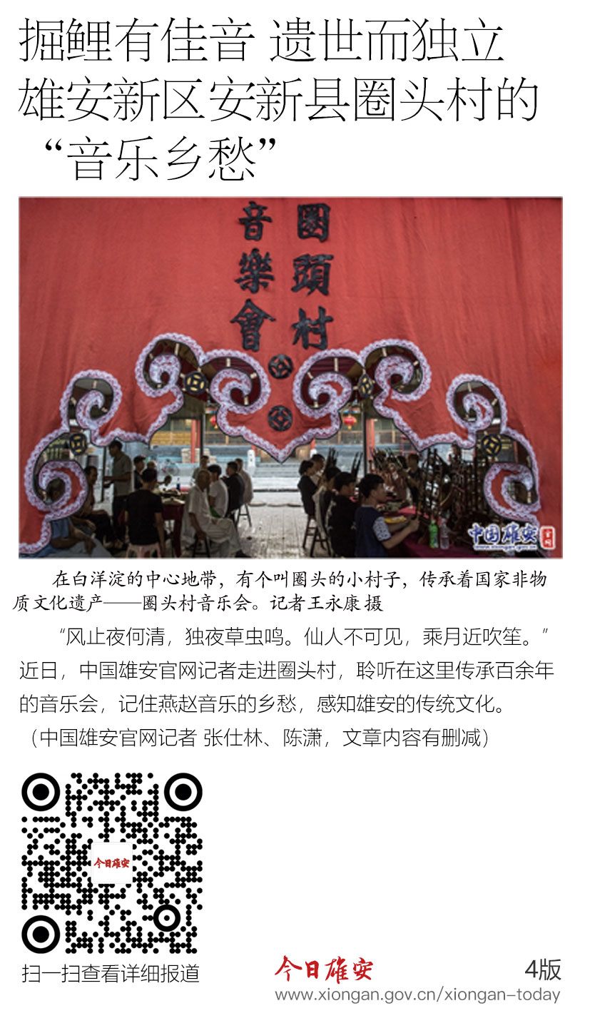 “风止夜何清,独夜草虫鸣。仙人不可见,乘月近吹笙。”近日,中国雄安官网记者走进圈头村,聆听在这里传承百余年的音乐会,记住燕赵音乐的乡愁,感知雄安的传统文化。